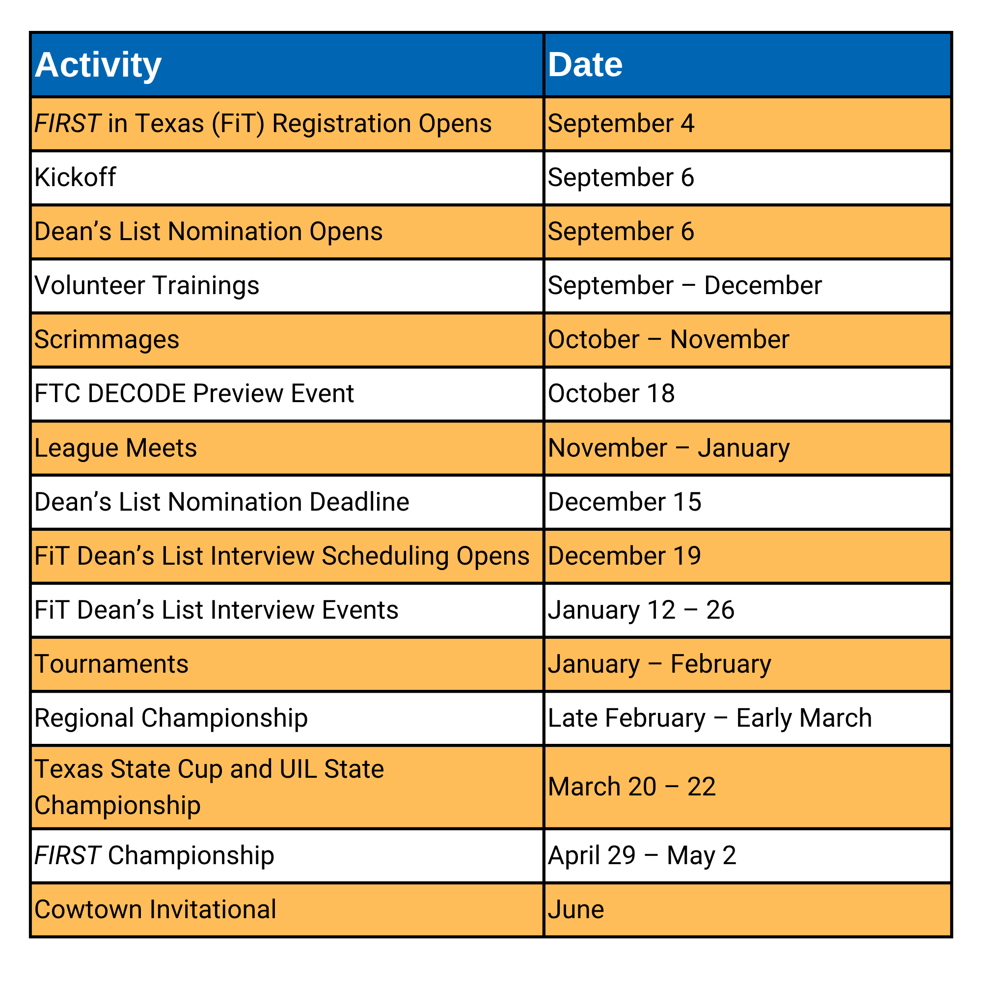 - Register for Events - make sure you are eligible to compete by completing both the FIRST and FIRST in Texas registrations.