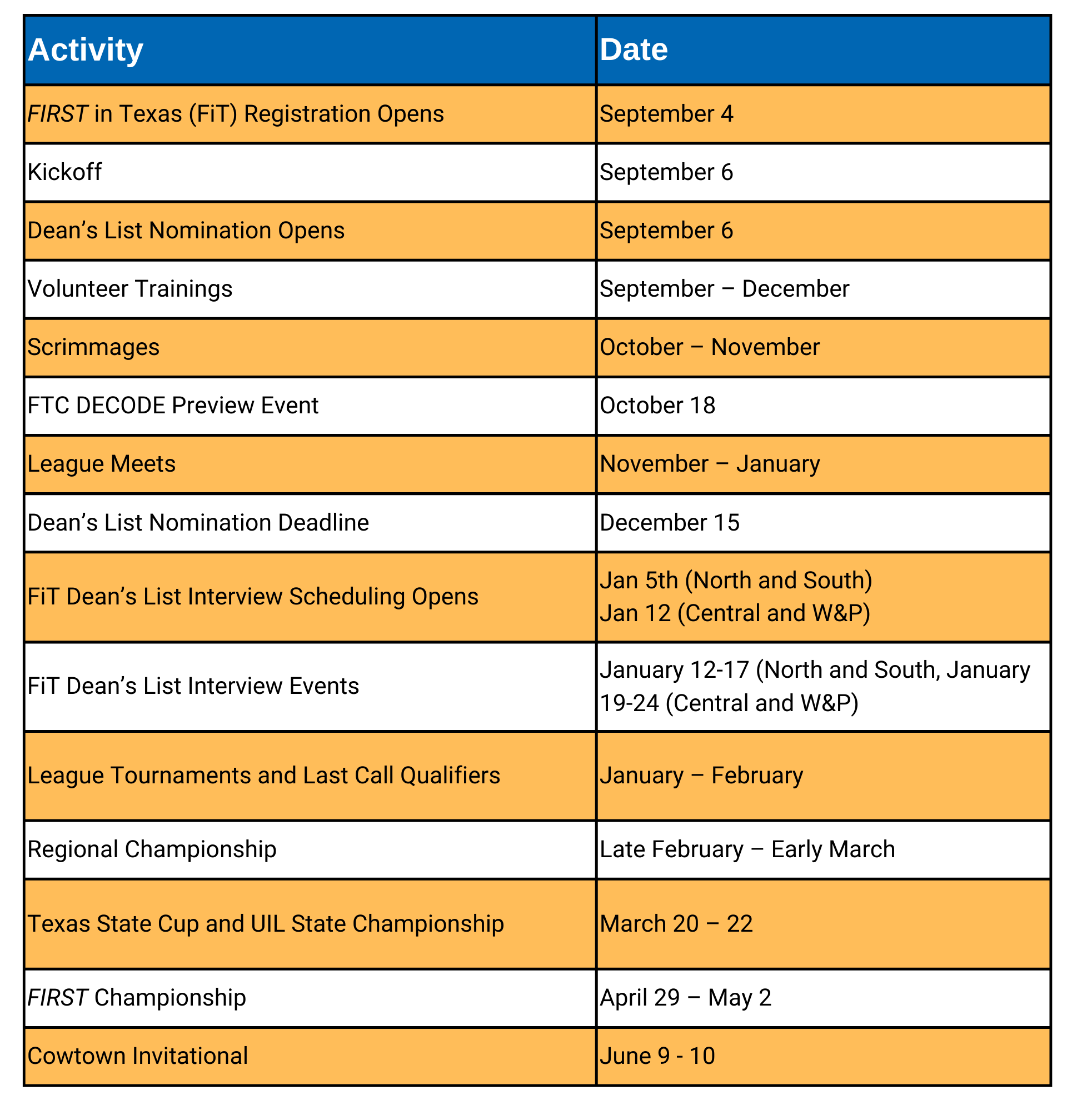 • Advancement Snapshot – A quick recap of this year’s advancement pathways, including FIRST Championship, Premier Events, State Cup, and UIL.